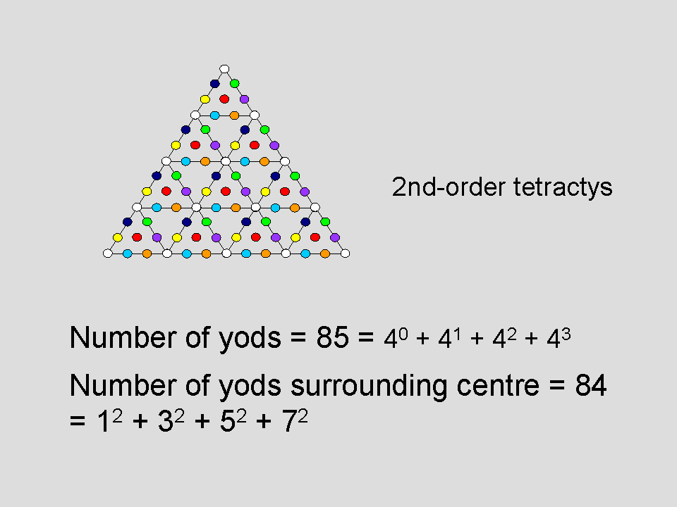 (the number value of YAH) is the sum of the first four integer powers of 2. There are (85–15=70) hexagonal yods, where 70 = 10×7 = (1+2+3+4)×fourth odd/prime number. These two properties illustrate again how the Tetrad determines properties of the next higher-order tetractys above the 1st-order tetractys. In mathematics, triangular numbers (1, 3, 6, etc) can be represented by triangular arrays of dots and tetrahedral numbers (1, 4, 10, etc) can be represented as a tetrahedral pile of these arrays. The piles representing tetrahedral numbers can themselves be piled up into 4-dimensional "tetrahedral numbers": 1, 5, 15, 35, 70, etc. The fourth, non-trivial example of these numbers is 70. This is the number of hexagonal yods in the 2nd-order tetractys. Once again, the Tetrad determines both a class of number and a specific member of this class that is a parameter, or measure, of the Pythagorean representation of Wholeness. It is an example of how the Tetrad Principle governs the mathematical nature of holistic patterns and systems (for more details, see Article 1).