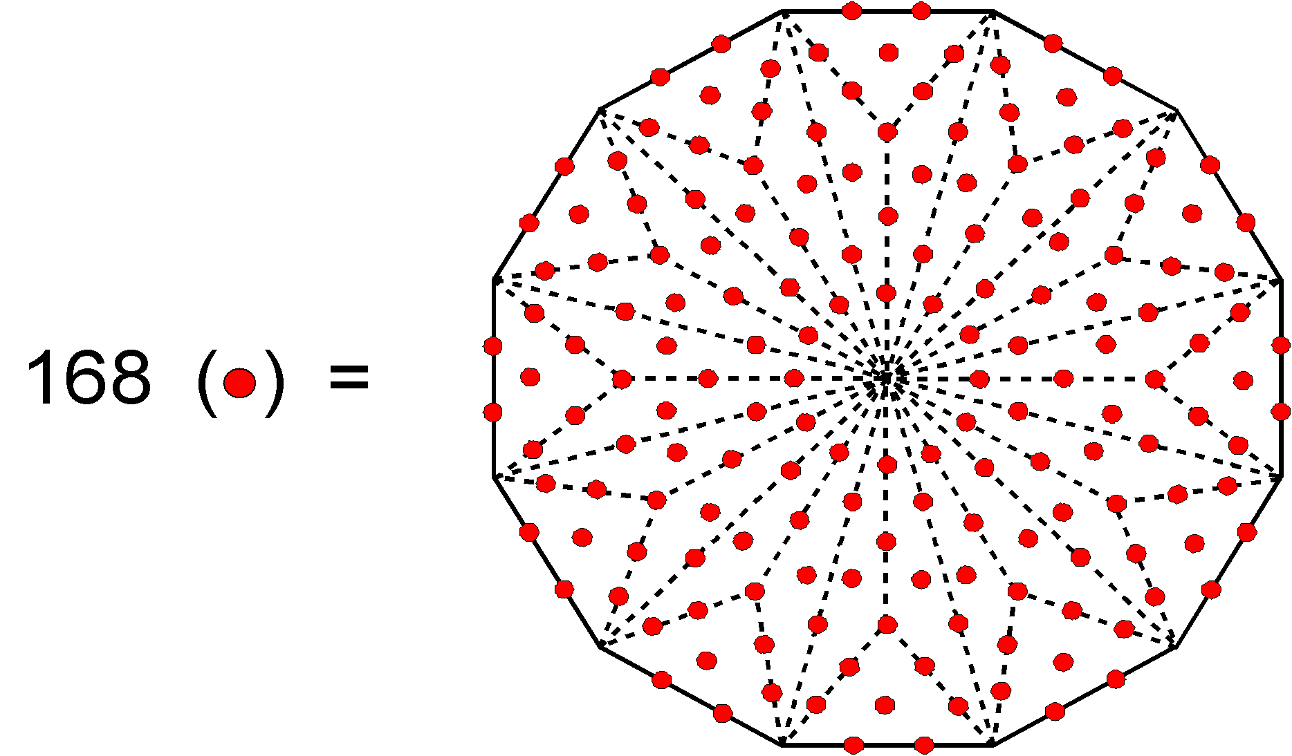 An alternative scheme: there are 5 green corners and 9 green hexagonal yods at the centres of tetractyses per sector of the dodecagon, which has altogether (12×14=168) green yods. The 108 tetractyses have 168 sides lined by 336 hexagonal yods (168 red yods and 168 blue yods). The centre of the dodecagon is surrounded by 504 yods consisting of three sets of 168 yods (red, green & blue). |