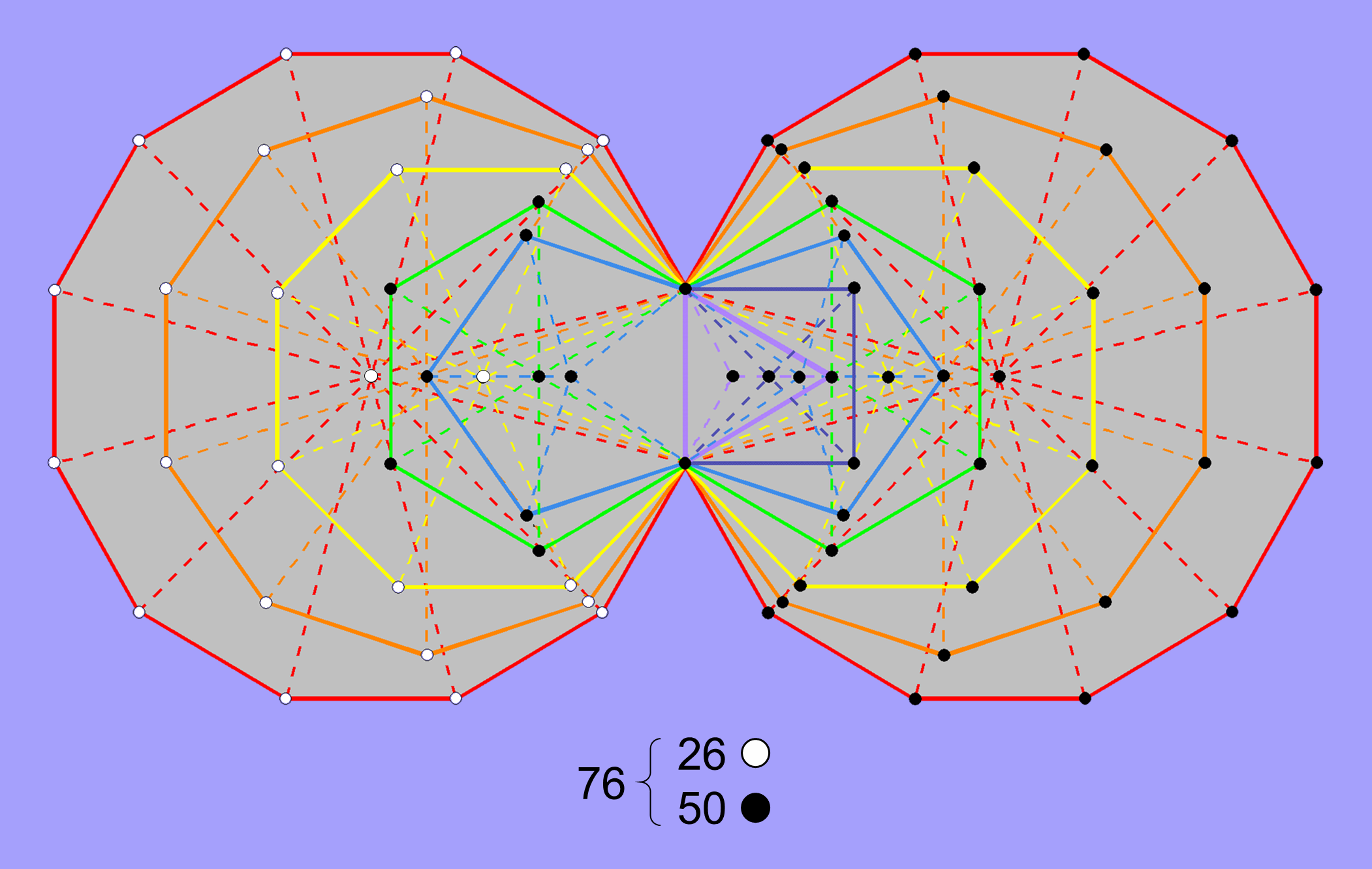 The next lower Vesica Piscis has Daath with number value 474 and Tiphareth, whose Godname is YAHWEH ELOHIM (76), located at the ends of its vertical diameter. At the ends of its horizontal diameter are Chesed, whose Godname EL has the number value 31, and Geburah, whose Godname ELOHA has number value 36. As shown in #7 of Maps of reality/Cosmic Tree of Life, the (7+5) regular polygons map CTOL because, separately (together with the root edge), they contain 550 yods symbolising its 550 SLs, of which 91 are corners symbolising its 91 Trees of Life (actually, their Tiphareths, that is, their centres). As shown in #9 of Maps of reality/Cosmic Tree of Life, these 12 polygons have 67 corners when enfolded, the set of seven enfolded polygons having 36 corners and the remaining five enfolded polygons having 31 corners. As 550 = 474 + 76, and 67 = 36 + 31, we see that the second Vesica Piscis, whose vertical diameter is the shared root edge of the polygons, determines the number of SLs in CTOL: