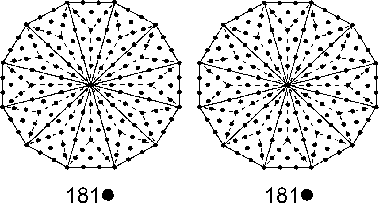 Their 50 faces have 180 triangular sectors with (90+180=270) sides. When the triangles are Type A, (3×180=540) sides are added, making a total of 810 sides. Joining the (50+50=100) vertices & face-centres to the centres of the five Platonic solids adds 100 sides, whilst the 270 internal triangles have (3×270=810) other sides when they are Type A. Hence, there are (810+100+810=1720) sides. The number of corners, sides & triangles in the five Platonic solids = 550 + 1720 + 1350 = 3620 = 362×10, where 362 is the number of yods in the two Type B dodecagons present in the inner form of the Tree of Life: