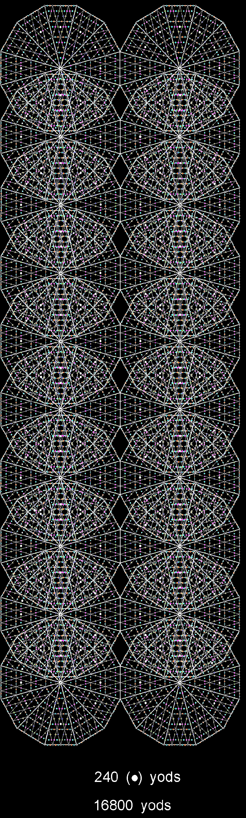 There are 240 white dots & white sides of triangles in every 10 overlapping Trees of Life that either belong solely to their outer form or are white centres of 100 of the 140 Type B polygons associated with these Trees that remain "pure" centres when the polygons become enfolded (note: centres of hexagons become corners of the triangles and centres of decagons become corners of pentagons). Green corners & sides of triangles in every 10 Trees become shared with enfolded polygons, whilst 40 green centres of 20 hexagons & 20 decagons coincide with corners of other polygons when they all become enfolded. 6720 corners & sides of the 2820 (=10×282) triangles in the 140 separate Type B polygons surround their centres.* 282 is the number value of Aralim, the Order of Angels assigned to Binah, and 140 is the number of Malachim, the Order of Angels assigned to Tiphareth.