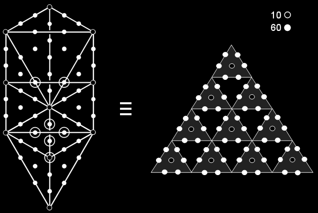 A 2nd-order tetractys contains 85 yods, where 85 = 40 + 41 + 42 + 43. Including the yods at the centres of the six triangular gaps between the 1st-order tetractyses in the 2nd-order tetractys generates a triangular array of 91 yods, where 91 = 12 + 22 + 32 + 42 + 52 + 62. 13 yods line each side of the array, so that a parallelogram made up of two triangular arrays of 91 yods placed back to back contains (91+91−13=169) yods. Surrounding the centre of a 10-pointed star whose points are these arrays are 1680 yods. Each 5-pointed star has 840 yods. Each point of the star contains 120 corners of 1st-order tetractyses and 720 hexagonal yods. The red 5-pointed star contains 120 black corners of 1st-order tetractyses and 720 red hexagonal yods. The blue 5-pointed star contains 120 white corners of 1st-order tetractyses and 720 blue hexagonal yods. The 1680 yods in the 10-pointed star comprise 240 corners of tetractyses and 1440 hexagonal yods. Compare this with the fact that a 600-cell is a polychoron with 120 vertices and 720 edges. The 10-pointed star is a representation of the compound of two 600-cells with 240 vertices and 1440 edges, each 5-pointed star representing a 600-cell. The 240 corners of 1st-order tetractyses denote the 240 vertices of the compound and the 1440 hexagonal yods denote the 1440 edges. Each point of the star contains 24 corners of 1st-order tetractyses. They correspond to the 24 vertices of a 24-cell, each 5-pointed star representing the compound of five disjoint 24-cells that make up a 600-cell. We saw in the last section that the 24 vertices of a 24-cell consist of the eight vertices of a 16-cell and the 16 vertices of an 8-cell. In the point of the 10-pointed star, they correspond to the eight corners of tetractyses outside the corner shared between star points that line two adjacent sides of the parallelogram and to the remaining 16 corners. This 10-pointed star representation of the 240 vertices of a compound of two 600-cells as the 4-dimensional projection of the 240 roots of E8 mapped by the 8-dimensional 421 polytope is a particularly clear demonstration of the 10-foldness of this number displayed by sacred geometries, as explained in #2 of 4-d sacred geometries. It should not, therefore, come as a surprise that the 1680 turns of each helical whorl of the UPA/heterotic superstring are generated in 10 half-revolutions (180°). The outer five half-revolutions of a whorl with 840 turns are represented by the 840 yods (120 corners, 720 hexagonal yods) in one 5-pointed star and its inner five half-revolutions with 840 turns are represented by the 840 yods in the other 5-pointed star. However, if we want to retain the correspondence between the 240 corners of tetractyses and the 240 vertices of the two 600-cells determining the 240 roots of E8, this correspondence cannot be interpreted as referring to a single whorl. Rather, each point in the 10-pointed star must correspond to either a whorl or (as we concluded in earlier sections of 4-d sacred geometries) a half-revolution of all 10 whorls of the UPA, which is represented by the whole star because the UPA "carries" the 240 gauge charges of E8 corresponding to its roots. The counterparts of this in the inner form of 10 Trees of Life (see right-hand picture) are the 1680 corners of the 2820 triangles in the (70+70) Type B polygons that are unshared with them. They comprise (120+120=240) red corners of the sectors of the 20 dodecagons and 720 remaining corners in each set of 70 enfolded polygons that are unshared with the outer Trees of Life. This demonstrates in an unequivocal way the Tree of Life basis of the 120:720 division in vertices & edges of each 600-cell. |