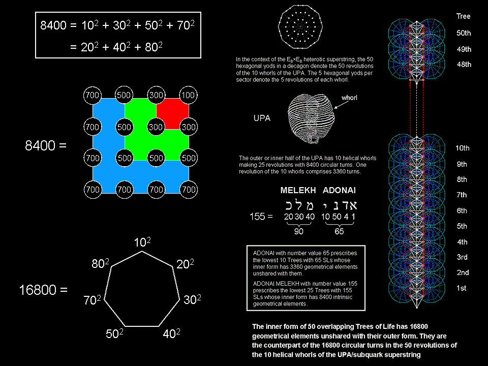 16800 yods outside their root edges surround the white yods at the centres of the 240 2nd-order tetractyses that make up the (10+10) dodecagons enfolded in 10 overlapping Tree of Life. The number of yods surrounding the centres of the 120 2nd-order tetractyses in each set of 10 dodecagons = 8400 = 102 + 302 + 502 +702. They denote the 8400 turns in the outer/inner halves of the 10 whorls of the UPA.