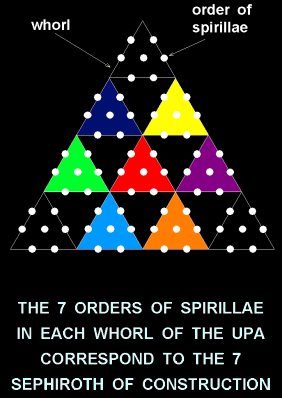 2 Which is the correct interpretation? The fact that each 600-cell has 1200 faces that, taken separately, have 8400 corners, sides & triangles corresponding to the 8400 turns in the inner or the outer half of the UPA supports Interpretation 2 as the more natural one because it explains not only why the UPA has two halves but why each half comprises five revolutions, each 600-cell being a compound of five 24-cells. In the case of interpretation 1, five whole whorls would have to correspond to each 600-cell, so that a whorl would have to correspond to a 24-cell, which leaves unexplained why it has an inner and an outer half and why each half has five half-revolutions. As shown on #3 of 4-d sacred geometries, sacred geometries comprise 240 structural components (yods or geometrical elements) that can be grouped naturally into a pair of five sets of 24. Each "half" of these sacred geometries has its 4-dimensional counterpart in the 600-cell, so that we can feel sure that the latter does, indeed, correspond to an inner or outer half of the UPA rather than to five complete whorls. It suggests, therefore, that a 24-cell defines a half-revolution of all 10 whorls of the UPA rather than one complete whorl. |