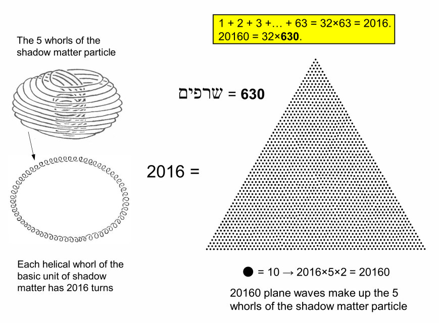 According to Ron Cowen, the shadow matter particle has five whorls. They should therefore comprise (5×2016=10080) turns. As circularly polarised waves, each one is the superposition of two perpendicular waves that oscillate 90 degrees out of phase with one another. The shadow matter particle comprises (10080×2=20160) plane wave oscillations. This number is generated by giving the weight of 10 to each of the 2016 dots present in the 63rd triangular number, as shown above. The sum of the 63 weighted dots on each side of the triangular array is 630. This is the number value of Seraphim (שרפים), meaning "Flaming Serpents" (Isaiah 6:6), the Order of Angels associated with Geburah.