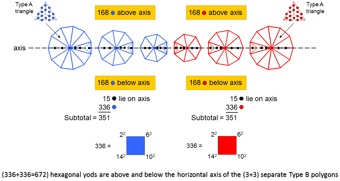 According to Table 2, the number of hexagonal yods (shown above as coloured red) in the 3 separate Type B polygons = 351. This is the number value of Ashim ("souls of fire"), the Order of Angels assigned to Malkuth. It is the 26th triangular number: 351 = 1 + 2 + 3 + ... + 26, where 26 is the number value of YAHWEH, the Godname of Chokmah. It is a parameter of the 10-tree whose 65 SLs are prescribed by ADONAI with number value 65 (see here). This is because the 70 enfolded polygons making up the inner form of 10 overlapping Trees of Life have 351 corners (see here). Each of the 3 polygons has an odd number of corners. Despite this, each one can be divided into two halves that are mirror images of each other if the plane of the mirror is perpendicular to the plane containing the polygon and passes through its centre. Consider the axis formed by a straight line passing through the centres of the 3 separate polygons. Imagine a mirror perpendicular to the planes of the polygons and passing through this axis. Each yod in the polygons above the axis has a mirror image below it. Five hexagonal yods (coloured black) in each polygon lie on the axis and are their own mirror images. The number of red hexagonal yods above or below the axis = 351 − 3×5 = 336. Therefore, the 3 polygons contain 168 hexagonal yods on either side of the axis. Similarly, the mirror-image set of 3 polygons have 168 blue hexagonal yods on each side of the axis, 336 in total. The (3+3) separate Type B polygons have (336+336=672) hexagonal yods on both sides of the axis, which contain (15+15=30) black hexagonal yods. Notice that the number value 15 of YAH, the shorter form of the Godname YAHWEH, and the number 351 prescribed by this Godname, determine the number 336. This is a defining parameter of holistic systems (see the picture depicting the holistic pattern at the beginning of this page). |