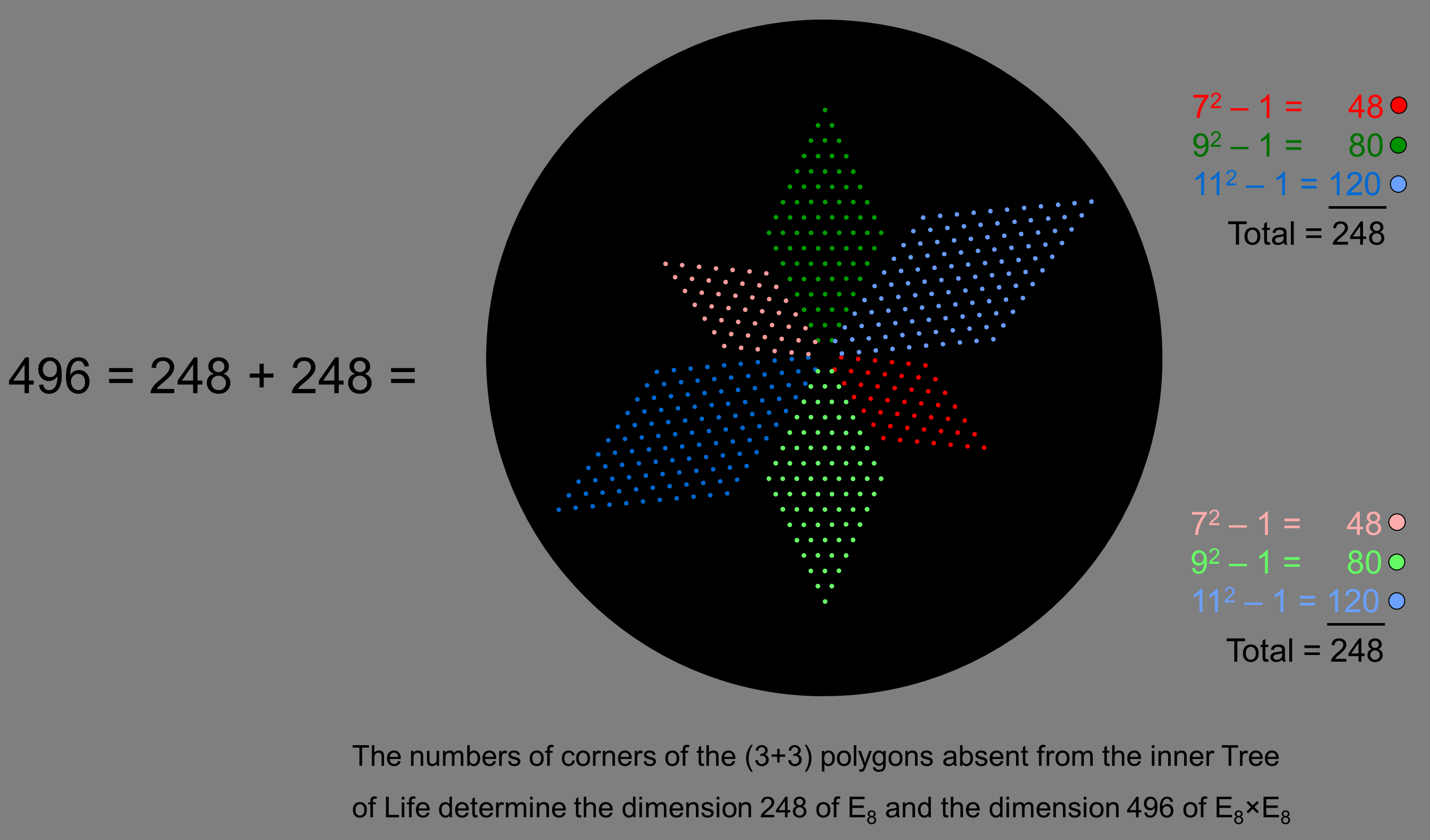 As 72 + 92 + 112 = 251, 72 − 1 + 92 − 1 + 112 − 1 = 251 − 3 = 248. This is the dimension of the rank-8, exceptional Lie group E8. Imagine 3 parallelogram arrays of dots with 7, 9 & 11 dots spaced evenly along each side. Suppose that they are connected at one corner. There are 248 dots surrounding their shared corner. Similarly for a second set of 3 parallelogram arrays corresponding to the mirror images of the first set. If all 6 parallelograms are connected at a corner, there are (248+248=496) dots surrounding this shared corner. The 3 regular polygons absent from the inner Tree of Life have the remarkable property that their numbers of corners generate the dimension 248 of E8, whilst the (3+3) sets of parallelograms corresponding to these 3 polygons and their mirror images generate the dimension 496 of E8×E8! As n2 = 1 + 3 + 5 +... + 2n−1, for any positive integer n, (n2−1) is the sum of the (n−1) odd integers 3, 5, ... 2n−1. The number 248 is the sum of (6+8+10=24) odd integers, where 24 = 52 − 1 = 3 + 5 + 7 + 9 = 4! = 1×2×3×4, showing the power of the Tetrad (4) to express this parameter of holistic systems. It also expresses the number 496 because 496 = 13 + 33 + 53 + 73, as well as the number (84) of corners & sides of the 27 sectors of the 3 separate polygons because 84 = 12 + 32 + 52 + 72. The number of dots in the parallelograms with 7 & 11 dots along each side = 48 + 120 = 168. This is the number value of Cholem Yesodoth, the Mundane Chakra of Malkuth, and the paranormally derived, superstring structural parameter widely discussed throughout this website because it is a primary parameter of sacred geometries. The 4 parallelograms corresponding to the heptagon, undecagon and their mirror images have (168+168=336) yods. This number always accompanies the parameter 168 in holistic systems. The division: 248 = 80 + 168 generated by the parallelogram associated with the nonagon with 9 corners and the parallelograms associated with the heptagon and undecagon with 18 corners manifests in the root composition of E8 as the 80 roots that comprise its 8 simple roots and the 72 roots of its exceptional subgroup E6 and as the remaining 168 roots. The number 80 is the number value of Yesod ("Foundation"), the Sephirah that precedes Malkuth ("Kingdom) with number value 496. The counterpart of this division in the geometry of overlapping Trees of Life can be seen here. Here is a simple, but remarkable, way in which the 3 polygons generate merely through their numbers of corners the group-theoretical numbers 248 & 496 that are central to E8×E8 heterotic superstring theory. It is yet more evidence that the 3 polygons absent from the inner Tree of Life represented by 7 types of polygons are analogous to the Supernal Triad of the outer Tree of Life in a way that is more than just formal, for they contain the same information (in terms of cosmic parameters) about the basic physics of matter as the 7 polygons — a repetition that would exceed all bounds of probability were the correspondence merely a formal one. |