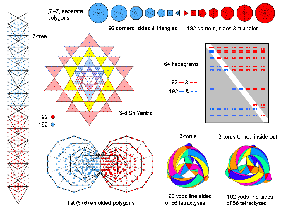 (see The holistic pattern), the fact that the two 600-cells have 240 vertices & 1680 edges & faces, i.e., 1920 vertices, edges & faces, implies that the complete, holistic system must comprise two 421 polytopes, so that the symmetry group for superstrings must be E8×E8. The master holistic pattern established in this website to be embodied by sacred geometries requires this direct product structure. The two mirror-image halves of the inner form of the Tree of Life, each encoding E8, are a simple illustration of this (e.g., as one of the many examples discussed elsewhere, see here). One 16-cell has 64 vertices, edges & faces. The three 16-cells in a 24-cell have 24 vertices and 168 edges & faces, i.e., 192 vertices, edges & faces. Because they embody the holistic parameter 192, which is half of 384, they represent half of a holistic system. The 7 regular polygons making up half the complete, inner form of the Tree of Life have 192 geometrical elements surrounding their centres (24 in the hexagon, 168 in the 6 other polygons). The three 16-cells, whose 24 vertices correspond to the 24 corners of sectors outside the root edge of the three enfolded polygons that are absent from the inner Tree of Life, must be complemented by the three 16-cells in the mirror-image set of three enfolded polygons. They make up the dual of the 24-cell, which is just a different configuration of another 24-cell.