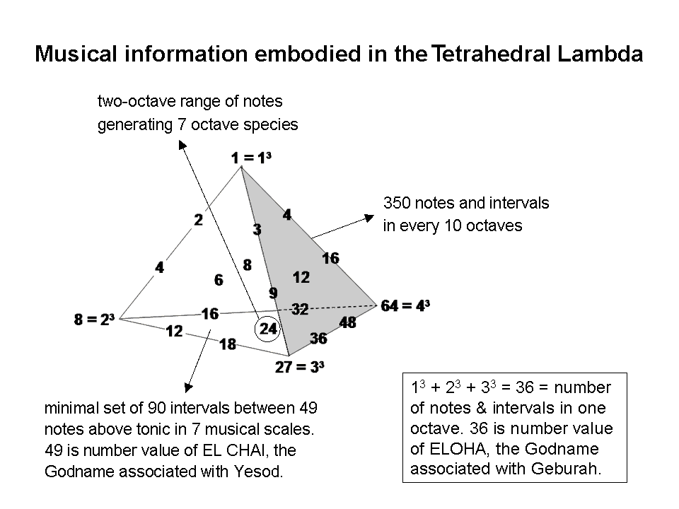 These examples serve to show how the archetypal Tetrahedral Lambda embodies numbers that determine not only the tone ratios of the Pythagorean musical scale but also the intervals in one scale and its ten octaves.