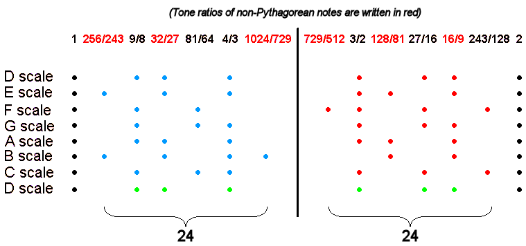 They comprise 26 Pythagorean notes made up of 14 notes (denoted below by blue dots) up to, and including, the perfect fourth) & 12 inversions (denoted by light red dots), as well as 16 non-Pythagorean notes denoted by grey dots:
