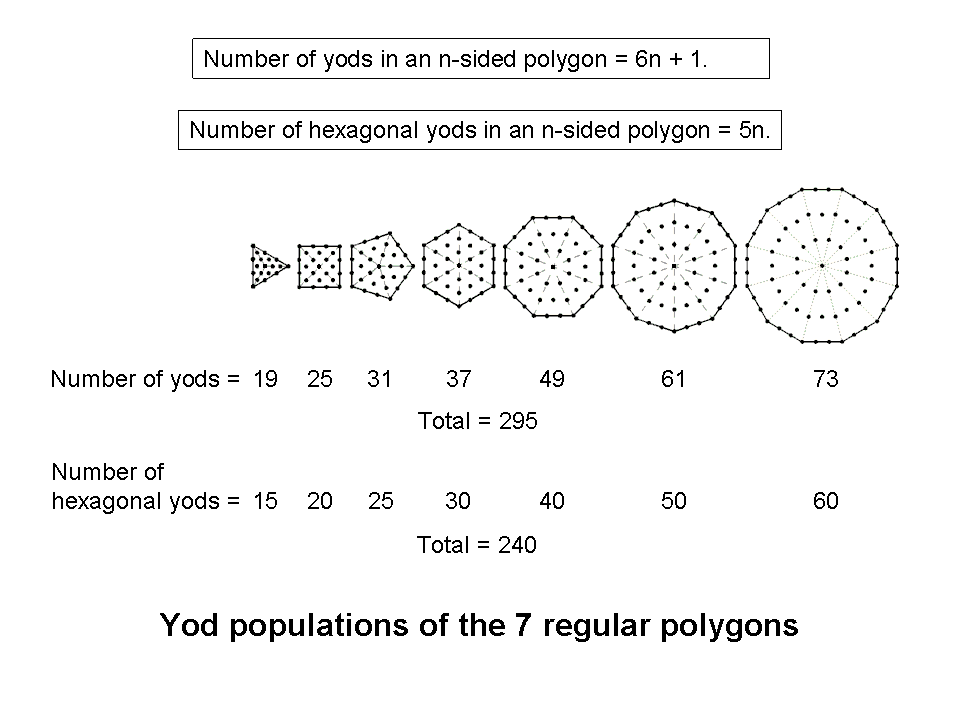 Viewed separately, the seven regular polygons making up the inner Tree of Life can be divided into their sectors. When the latter are turned into tetractyses, the seven separate polygons have 295 yods, of which 240 are hexagonal yods. Two of the polygons have yod populations that are number values of Godnames — the pentagon with 31 yods (the number of EL, the Godname assigned to Chesed in the Tree of Life) and the octagon with 49 yods (the number value of EL CHAI, the Godname of Yesod). |